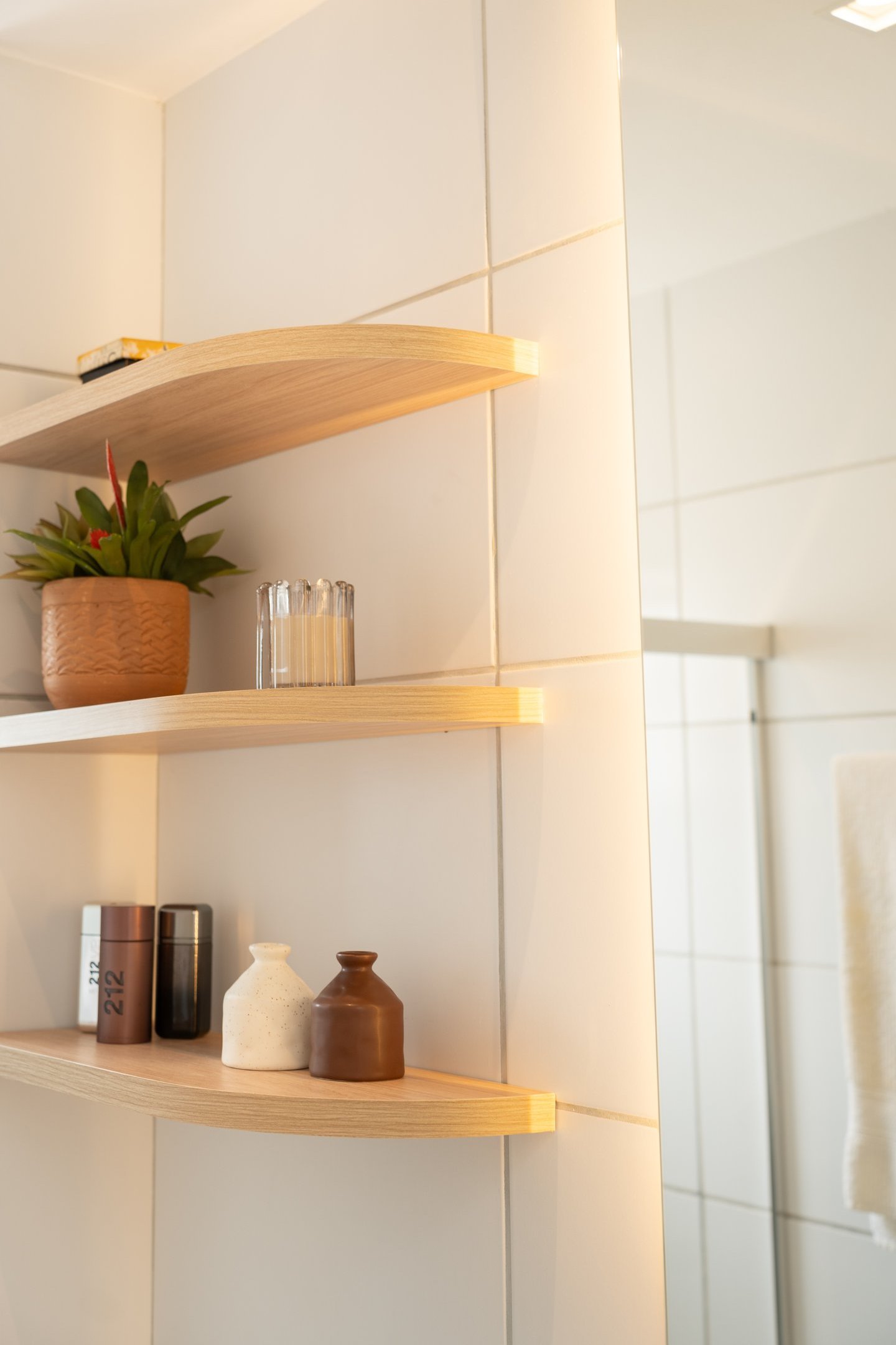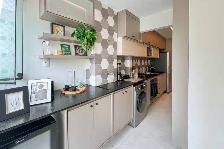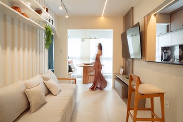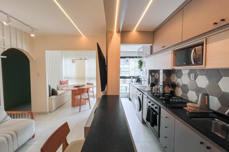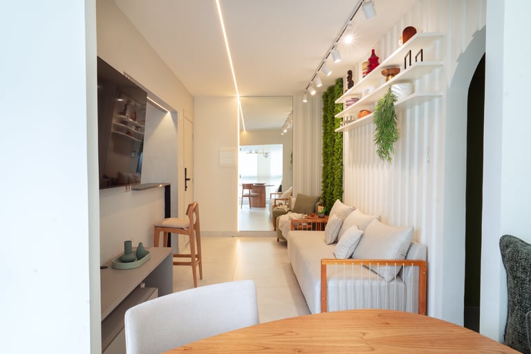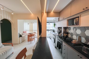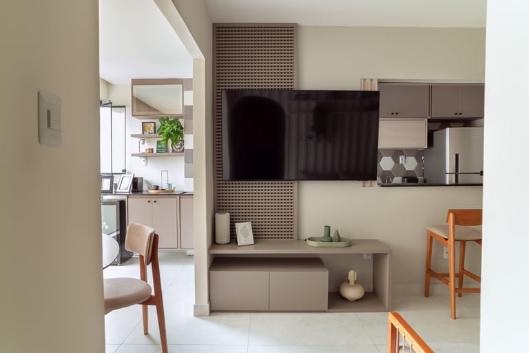 Trabalhamos com a integração da área social, criando um espaço único e funcional. Com a retirada das portas existentes que separavam a varanda da sala e cozinha, mudamos o layout original, trazendo a mesa para a varanda e a televisão para o lado oposto. Criando dessa forma uma sala muito mais confortável e convidativa.