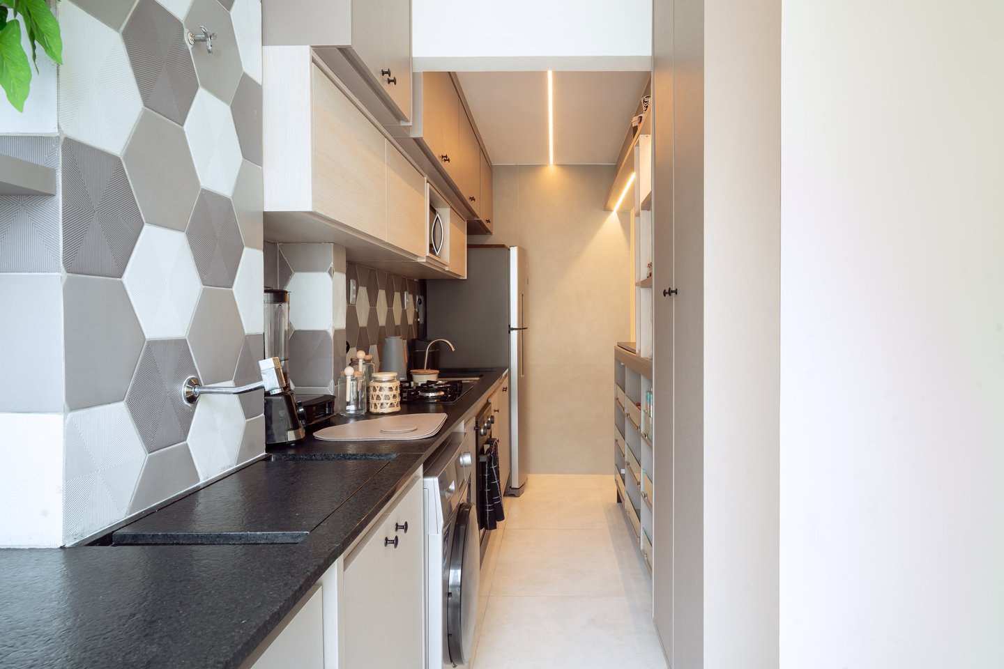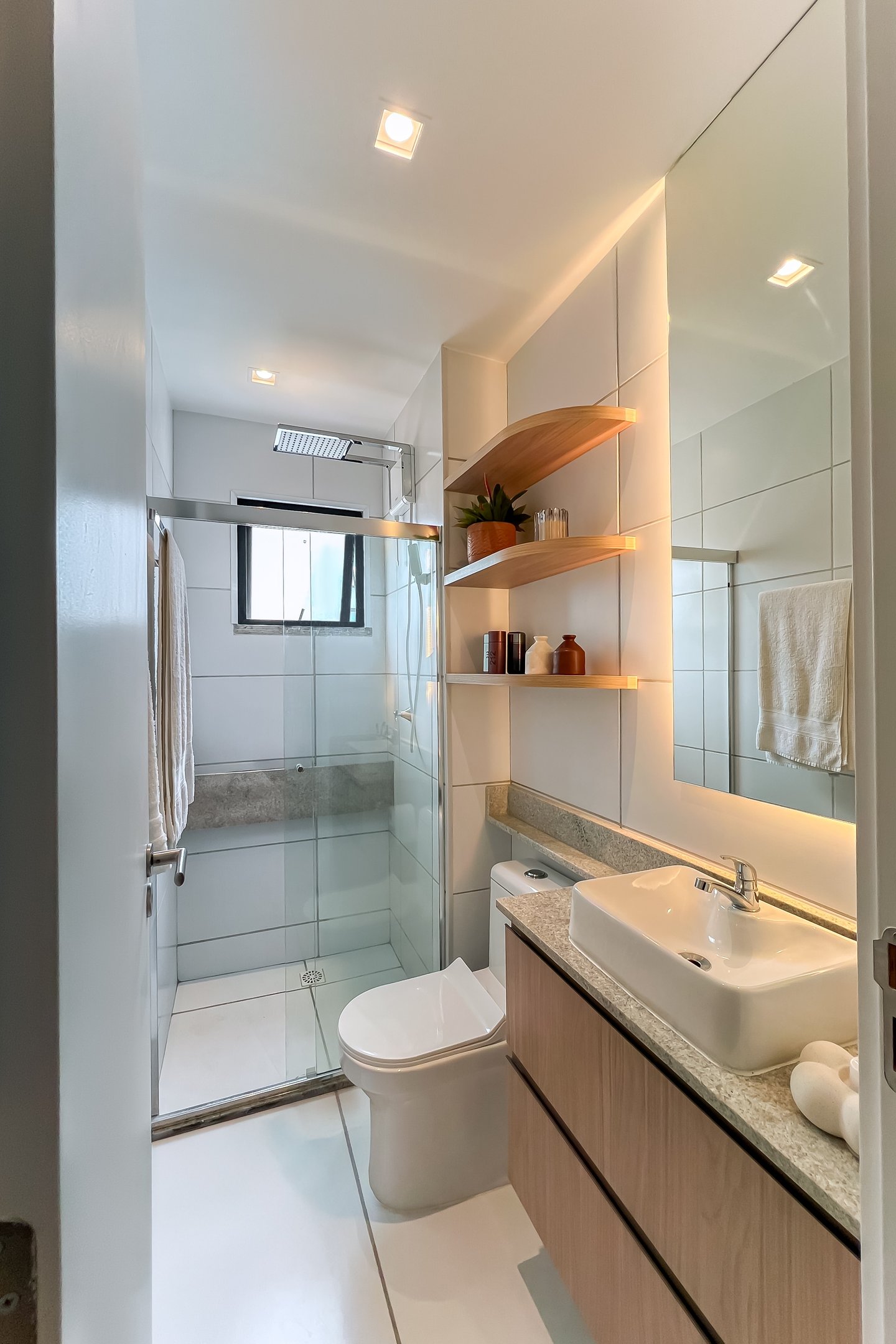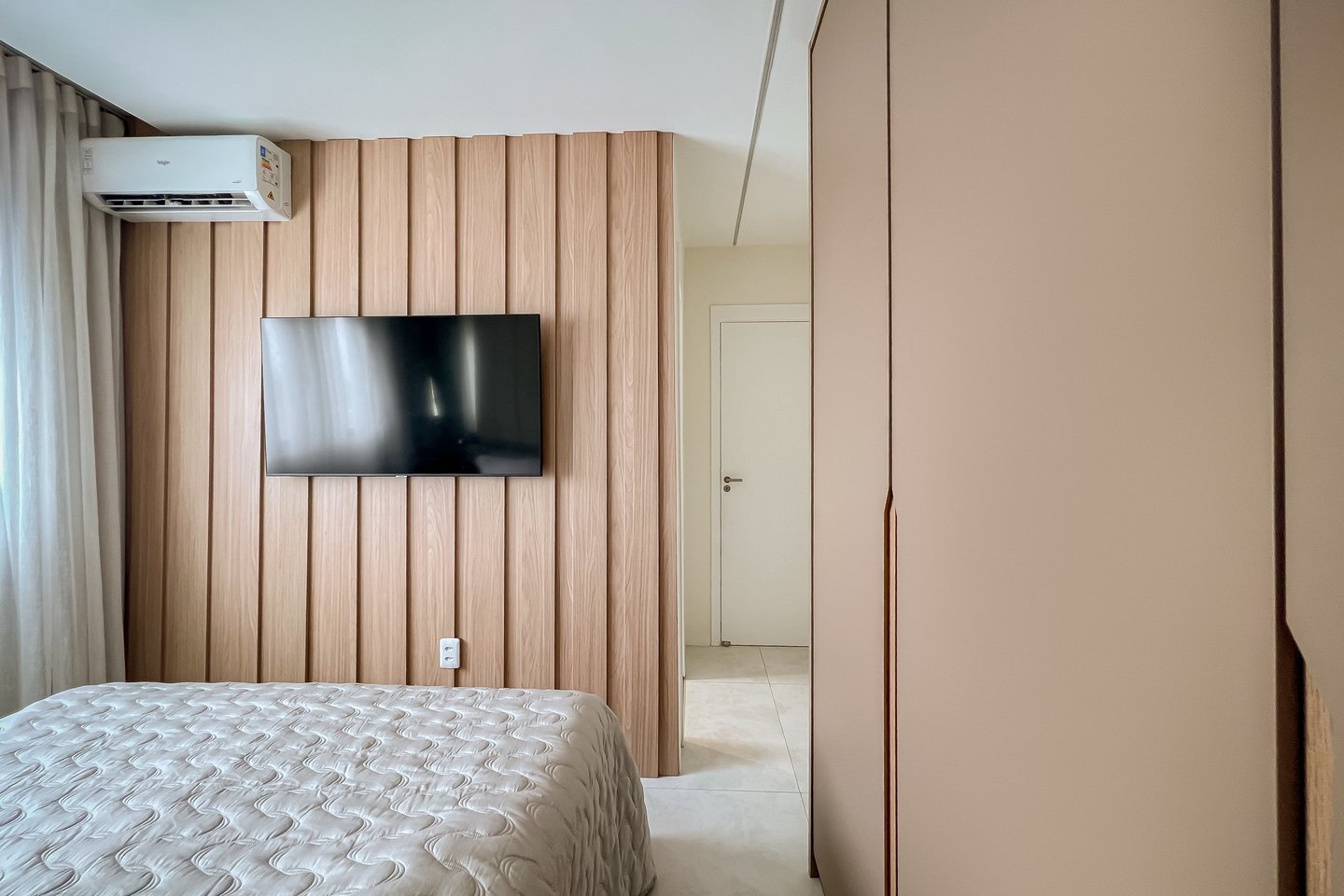 Trabalhamos com a integração da área social, criando um espaço único e funcional. Com a retirada das portas existentes que separavam a varanda da sala e cozinha, mudamos o layout original, trazendo a mesa para a varanda e a televisão para o lado oposto. Criando dessa forma uma sala muito mais confortável e convidativa.