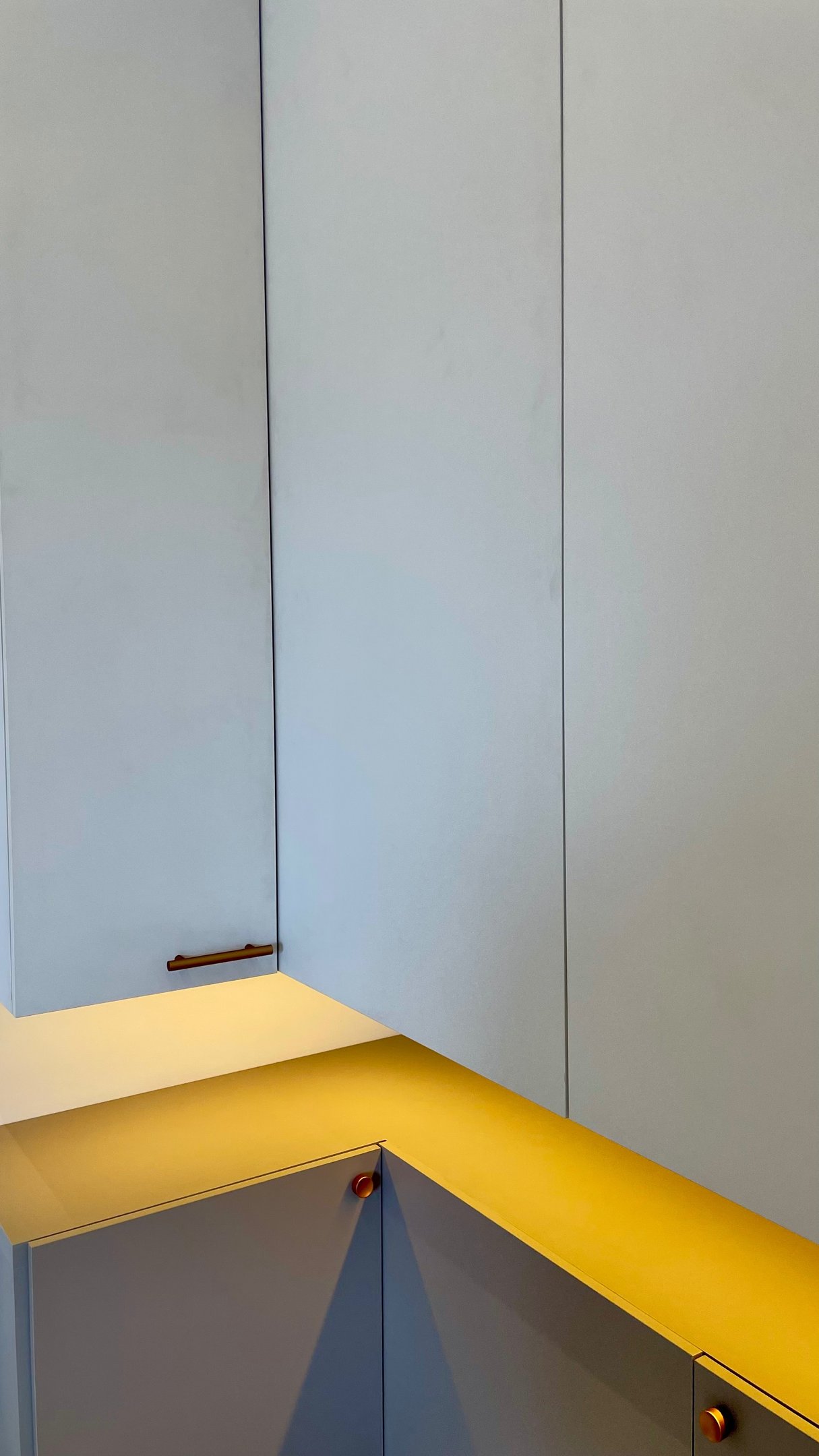 Uma das principais necessidades era a criação de muitos espaços de armazenamento. Para isso, foram projetadas duas paredes com guarda-roupas, garantindo funcionalidade e organização. Para evitar um excesso visual da marcenaria, um dos armários recebeu uma quebra de volume e iluminação integrada, trazendo leveza ao ambiente.