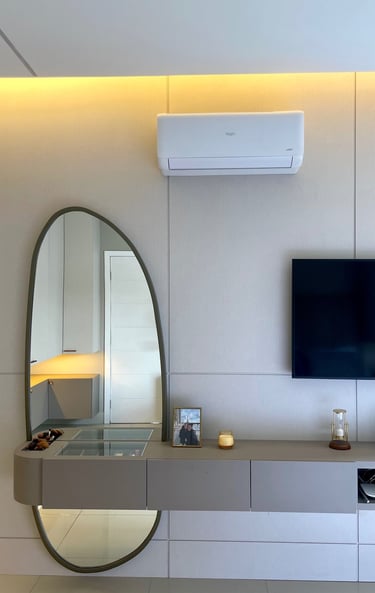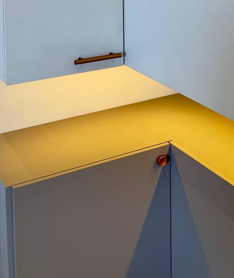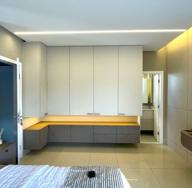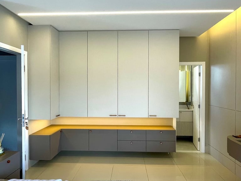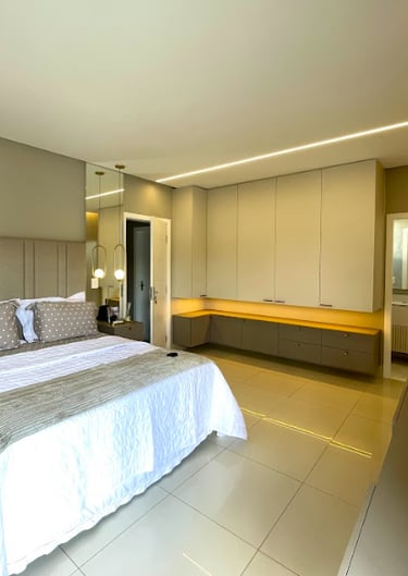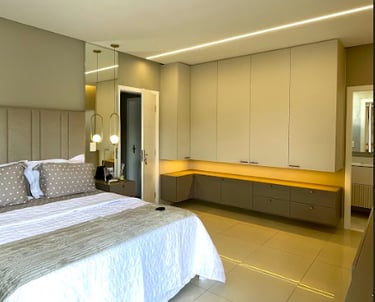 Uma das principais necessidades era a criação de muitos espaços de armazenamento. Para isso, foram projetadas duas paredes com guarda-roupas, garantindo funcionalidade e organização. Para evitar um excesso visual da marcenaria, um dos armários recebeu uma quebra de volume e iluminação integrada, trazendo leveza ao ambiente.