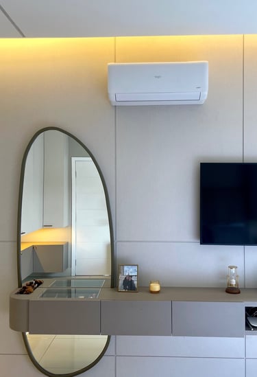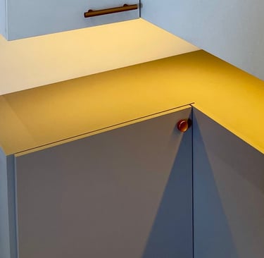 A escolha dos materiais seguiu uma paleta neutra, com tons de MDF combinados à iluminação, criando um espaço equilibrado, funcional e visualmente agradável.