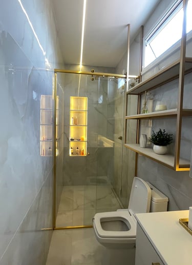 O banheiro passou por uma reforma total, incluindo a substituição de revestimentos e o desenvolvimento da marcenaria sob medida. Todas as escolhas seguiram o estilo do casal, aplicado de forma consistente em cada elemento do projeto.